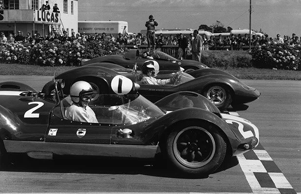 In fact, one of the first big bells to ring on this visit to Goodwood, is the one that marks Bruce McLarens first outing with the new breed of sports racers that developed into these ground shakers that Can-Am became. He called it the M1a; any rate, that was born ’63 and sat on the front row at Goodwood a year later in an ‘Unlimited Sports Car’ race, with Jim Clark’s Lotus 30 sitting between Bruce and one G Hill sat outside of him. Both the V8s dnf-ed but the die was cast with English manufacturers supplying so many Can Am racers through Lola, March & McLaren from then on.